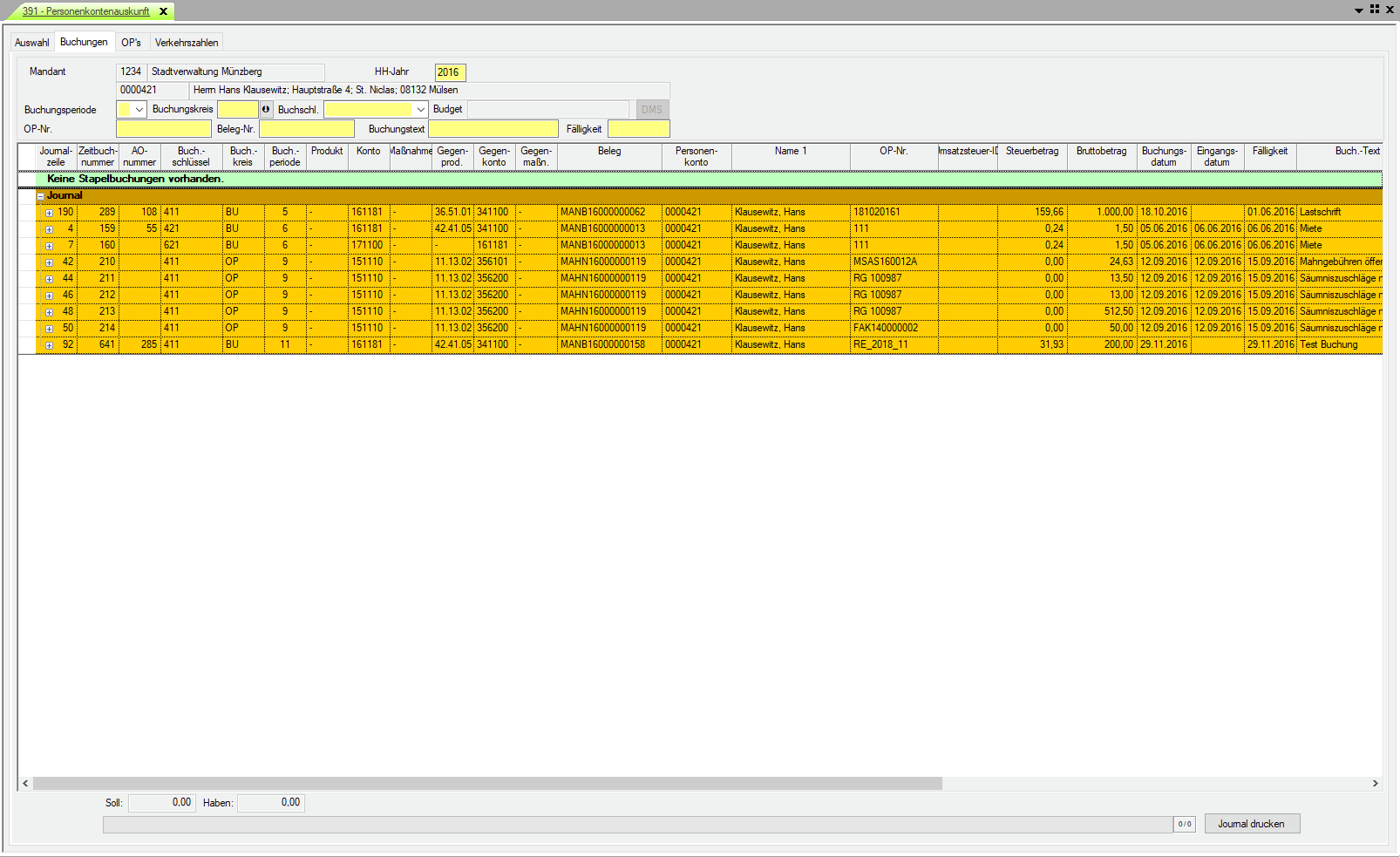 Beim Aufruf der Registerkarte „doppische Buchungen“ werden nach Buchungsperiode aufsteigend alle Einzelbuchungen zum Personenkonto angezeigt.