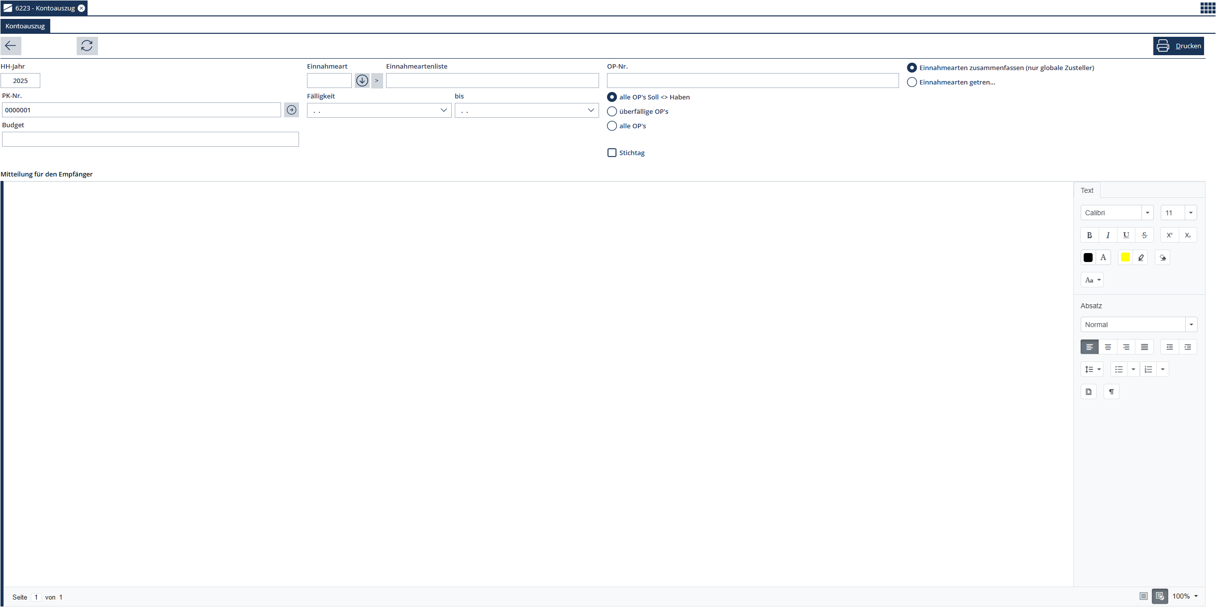 Im oberern Teil der Maske wird Mandant, HH-Jahr und das Personenkonto angezeigt. Im unteren Teil hat man die Möglichkeit einen individuellen Text zu verfassen der dann beim Druck mit auf dem Kontoauszug steht.