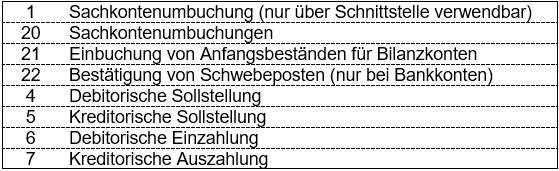 Im Journal finden Sie künftig alle Buchung. Eine Sollstellung, Umbuchung oder Einzahlungsbuchung kann am Buchungsschlüssel unterschieden werden. In der nachfolgenden Tabelle steht die Zuordnung der Buchungsschlüssel zu den Buchungsarten aufgeführt:
