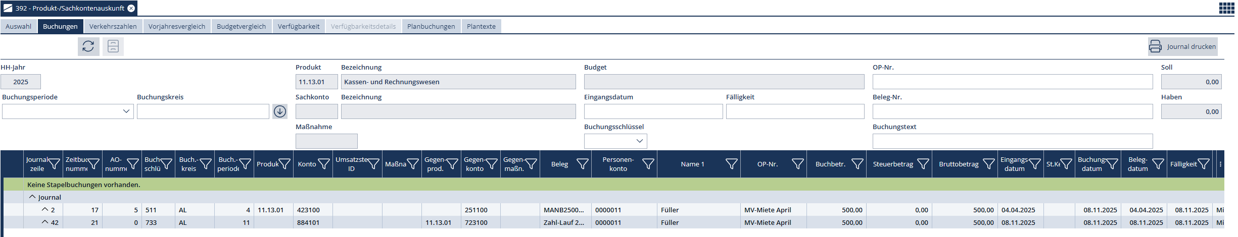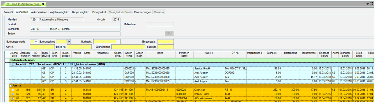 Aktualisierung mit F5 zur Anzeige der Buchungen zum gewählten Produkt, Maßnahme oder Sachkonto.