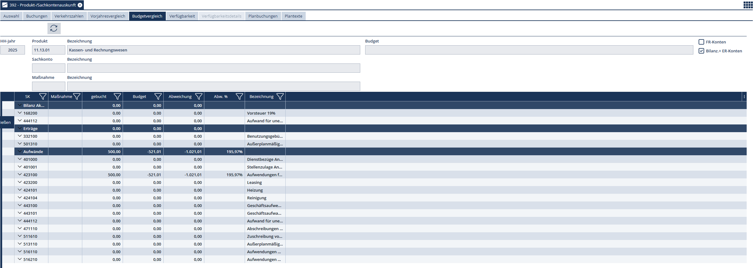 Der Budgetvergleich stellt das Saldo Verkehrszahlen des aktuellen Haushaltsjahres und das Budget des aktuellen Haushaltsjahres gegenüber und weist die Differenz sowohl absolut wie auch prozentual aus.