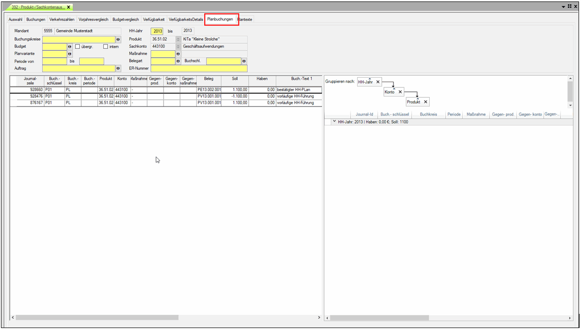 | Navigator | Buchung - Auskunft - Sachkonten - Reiter Planbuchungen |