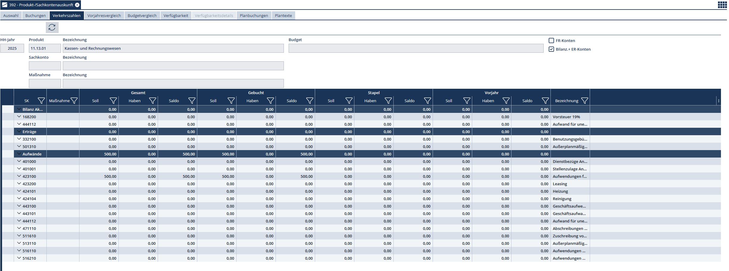 Die Besonderheit dieser Registerkarte ist die Spalte "Stapel". In ihr stehen die Beträge, die durch Buchungen, die sich noch im Stapel befinden, getätigt wurden. Bis zur endgültigen Verbuchung werden sie auf diese Weise abgegrenzt. Sie fließen aber dennoch schon in das Ergebnis der Spalte "Gesamt" ein.