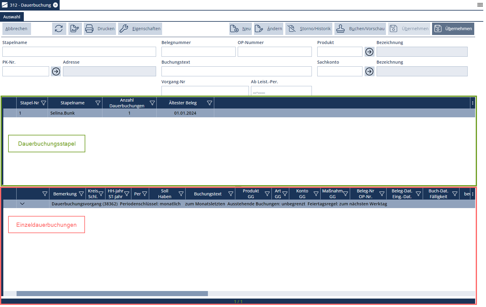 Nach dem Öffnen der Funktion werden in der zweigeteilten Ansicht im oberen Fensterbereich bereits vorhandene Dauerbuchungsstapel und im unteren die bereits angelegten Dauerbuchungen angezeigt.