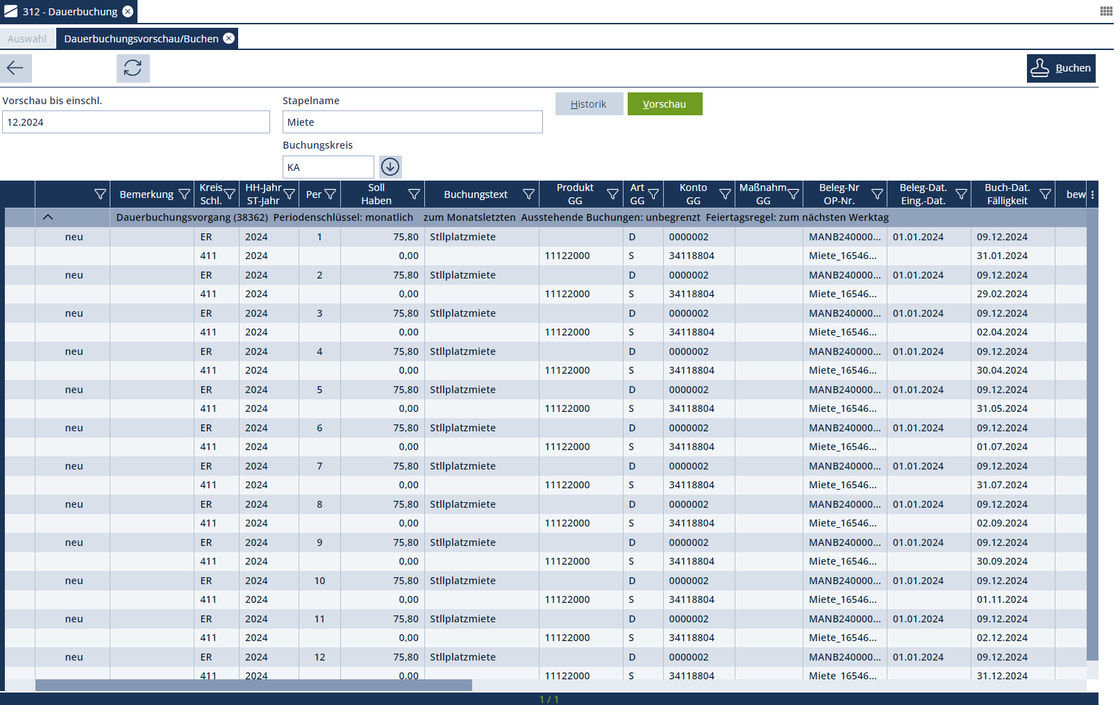 Nach Eingabe des Buchungszeitraums werden entsprechend des Periodenschlüssels, alle Einzelbuchungen angezeigt die dann mit dem Button "Buchen" übernommen werden können.