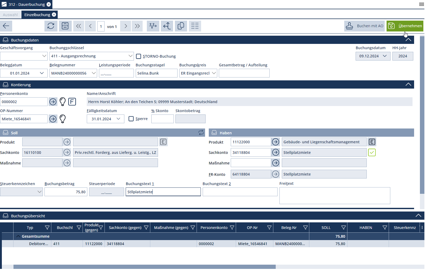 Eine Daucherbuchung kann für den markierten Dauerbuchungsstapel über den Button "Neu" angelegt werden. Es öffnet sich der Erfassungsdialog analog der Einzelbuchungsmaske. Mit dem Button "Übernehmen" wird die erfasste Einzelbuchung übernommen.