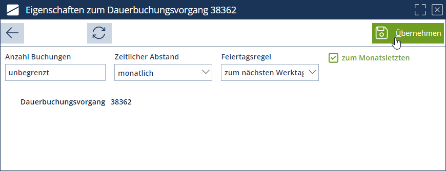 Erforderliche Veränderungen hinsichtlich der Periodizität oder Anzahl der Buchungen können durch Änderung über den Button "Eigenschaften" erfasst und über den Button "Übernehmen" gespeichert werden.