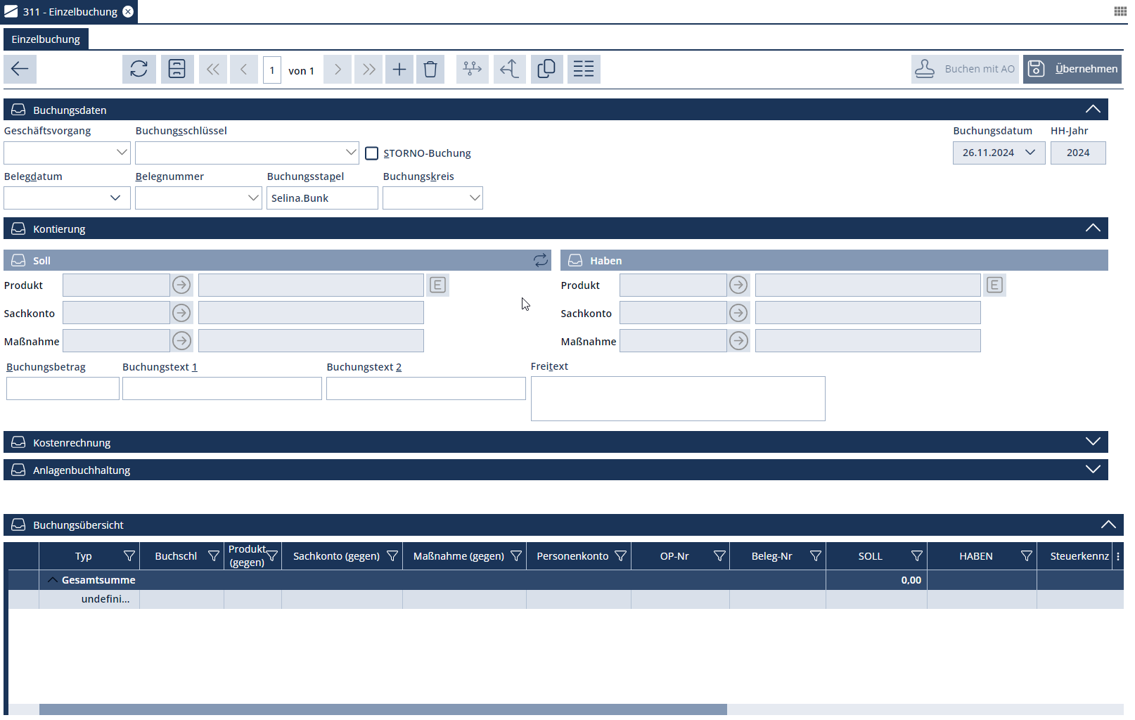 Die Einzelbuchungsmaske ist mit folgenden Panels unterteilt: