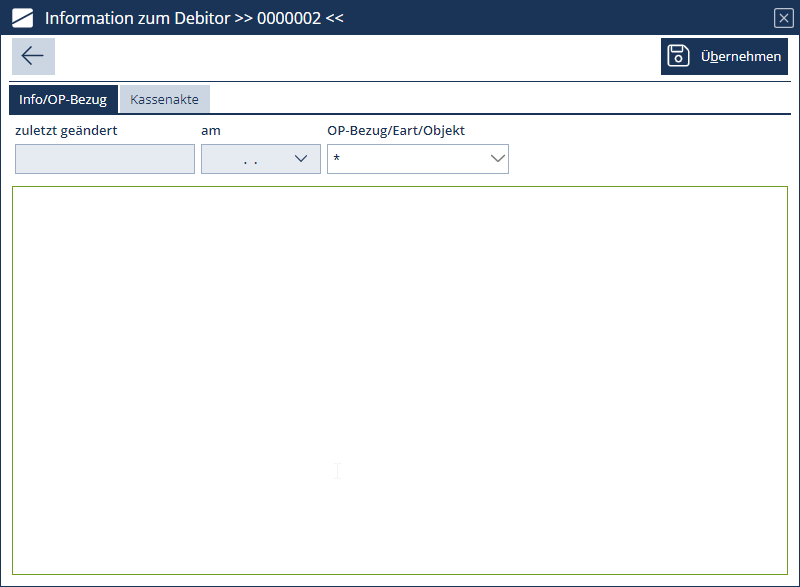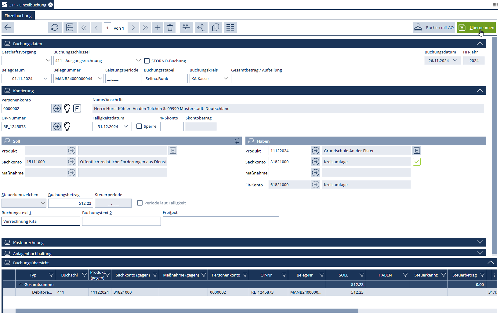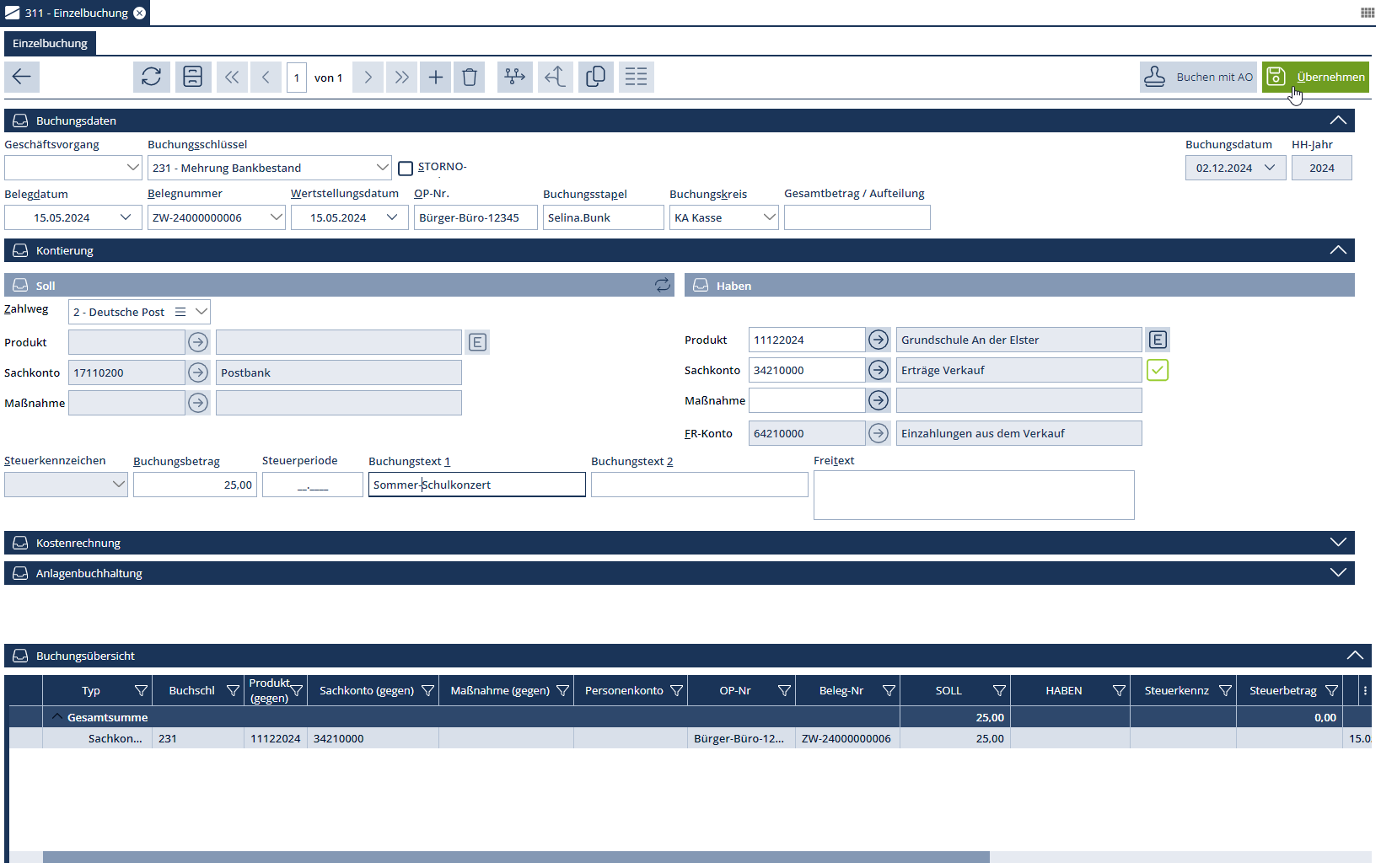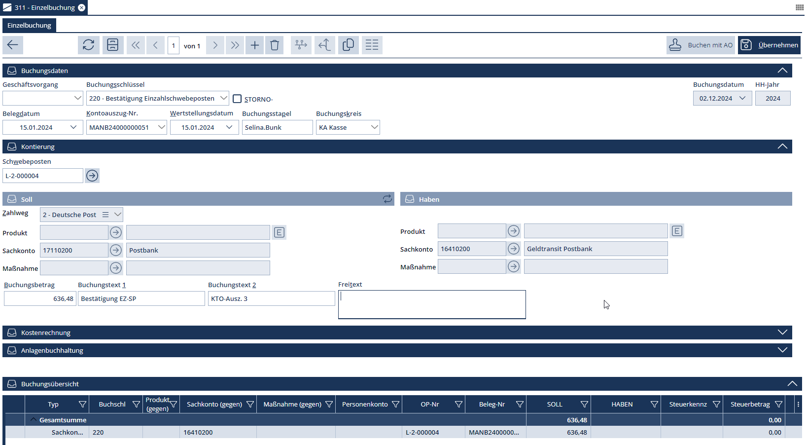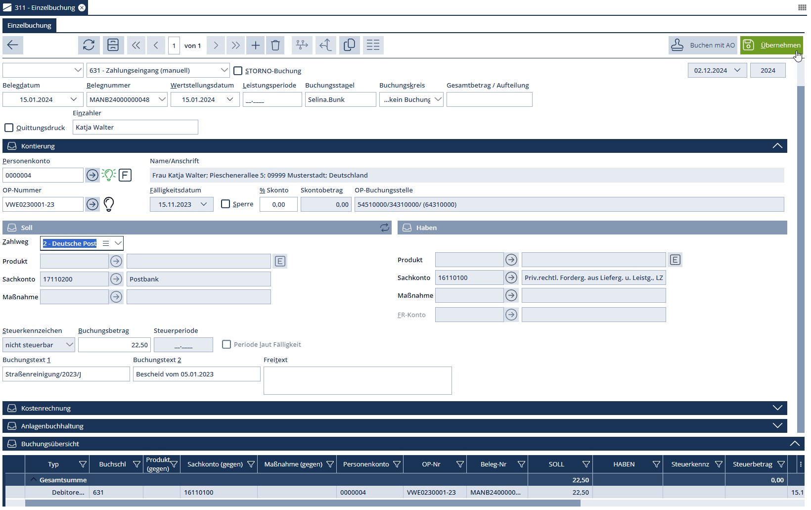 Zur Erfassung einer gezielten Zahlung ist es bei der Eingabe der Buchungsdaten entscheidend, dass ein bestehender Offener Posten des Personenkontos ausgewählt wird. In Abhängigkeit des verwendeten Buchungsschlüssels sind ausgehend von der Buchung für debitorische Zahlungen (631) einige unterschiedliche Eingabefelder in der Buchungsmaske zu füllen. Nach Eingabe aller für die Buchung notwendigen Daten wird die Buchung mit Betätigung des Buttons „Übernehmen“ gespeichert. Mit Eingabe eines Aufteilungsbetrages im Feld „Gesamtbetrag/Aufteilung“ besteht die Möglichkeit eine Aufteilungsbuchung zu erfassen, dabei kann die Buchung erst übernommen werden wenn der Aufteilungsbetrag mit den erfassten Buchungen zu Null aufgeht.