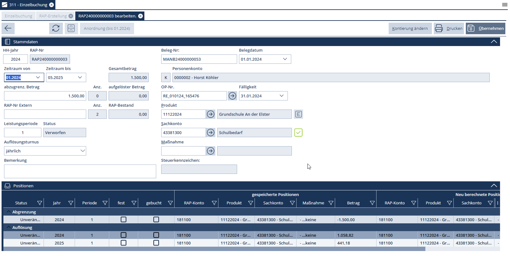 Mit Verbuchung werden sofort auch die Abgrenzungsbelege und die Auflösungsbelege für das eingestellte Haushaltsjahr erzeugt. Eine Verfügbarkeitsprüfung erfolgt für den Auflösungsbetrag im eingestellten Haushaltsjahr.
