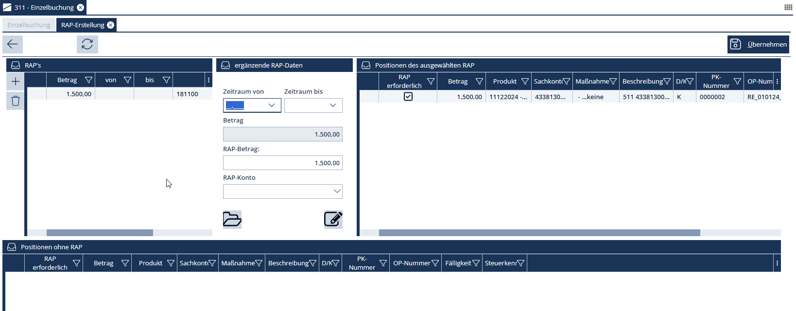 In dieser Maske kann zunächst der Zeitraum und das RAP-Konto eingetragen werden. Werden mehrere Positionen benötigt, können diese im Linken Teil der Maske mit dem Botton hinzugefügt werden und mit dem Botton gelöscht werden. Die zu bearbeitende Zeile muss in dieser Tabelle markiert werden.