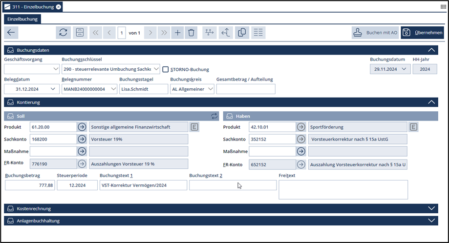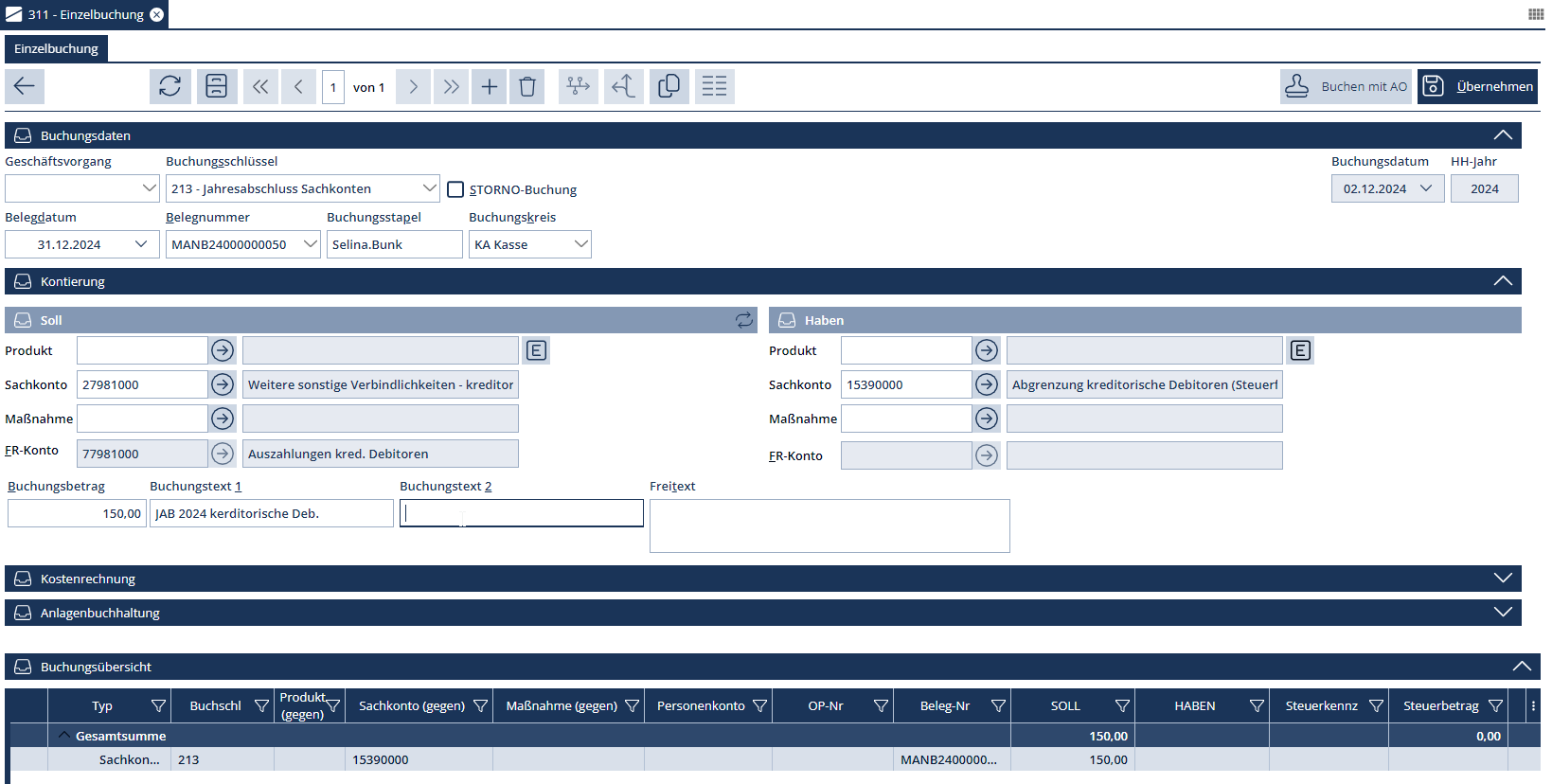 Nach Eingabe aller für die Buchung notwendigen Daten wird die Buchung mit Betätigung des Buttons „Übernehmen“ gespeichert. Die Buchung mit dem Buchungsschlüssel 212 bzw. 312 erfordert seitens der Kontierung lediglich die Eingabe des vorzutragenden Bilanzkontos. Auf der Gegenbuchungsstelle wird automatisch das Vortragssammelkonto für Sachkonten (Kontenart 21) vorgeschlagen.