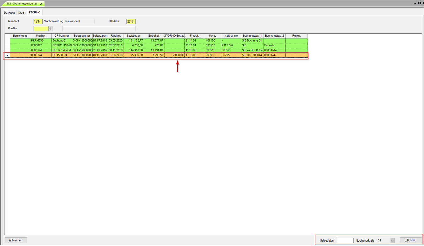 Hierzu ist in der Spalte Storno-Betrag der gesamte Betrag bzw. der anteilige Betrag einzugeben sowie ein Belegdatum. Danach über den „STORNO“ die Stornierung durchführen.