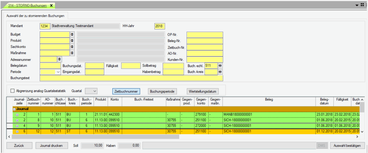 Im Übersichtsfenster „STORNO-Buchungen“ werden entsprechend der in den Suchfeldern angegebenen Kriterien die vorhandenen Sachkonten- und Sollstellungsbuchungen des aktuellen Haushaltsjahres aufgelistet.