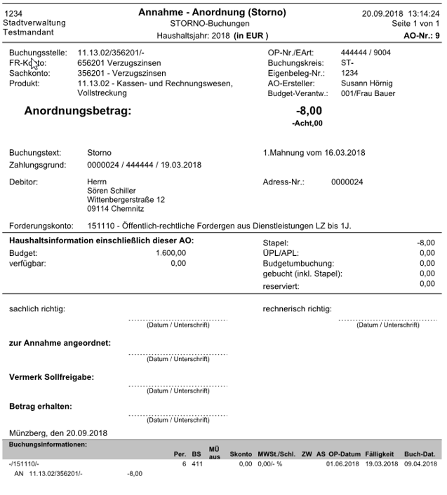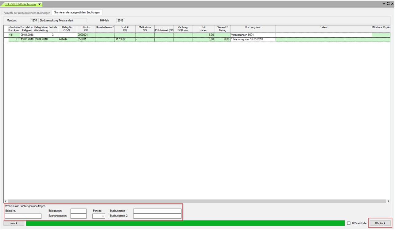 Nach Eingabe des Belegdatums und der Bestätigung der vorgeschlagenen Belegnummer bzw. individueller Vergabe kann hierzu ein entsprechender AO-Druck zu der storniereten Buchung getätigt werden.