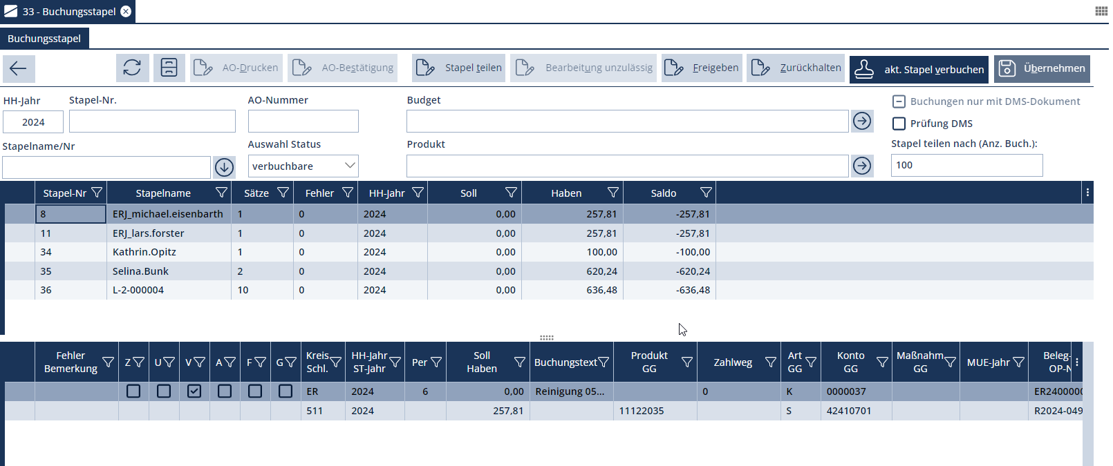 Die Verbuchung erfolgt über den Button „akt. Stapel verbuchen“.