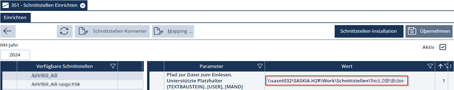 Nach Eingabe des Haushaltsjahres wird zunächst ein Überblick verfügbaren Schnittstellen, sortiert nach Eingangs- und Ausgangsschnittstellen, angezeigt. Durch Markieren einer Schnittstelle werden in der rechten Übersichtstabelle alle wichtigen Eingaben zu dieser Schnittstelle, wie Datenpfad, Dateibehandlung, usw., eingeblendet und können hier durch Eingabe oder Auswahl direkt in der Tabelle verändert werden. Die Veränderungen werden abschließend mit dem Button „Übernehmen“ gespeichert.