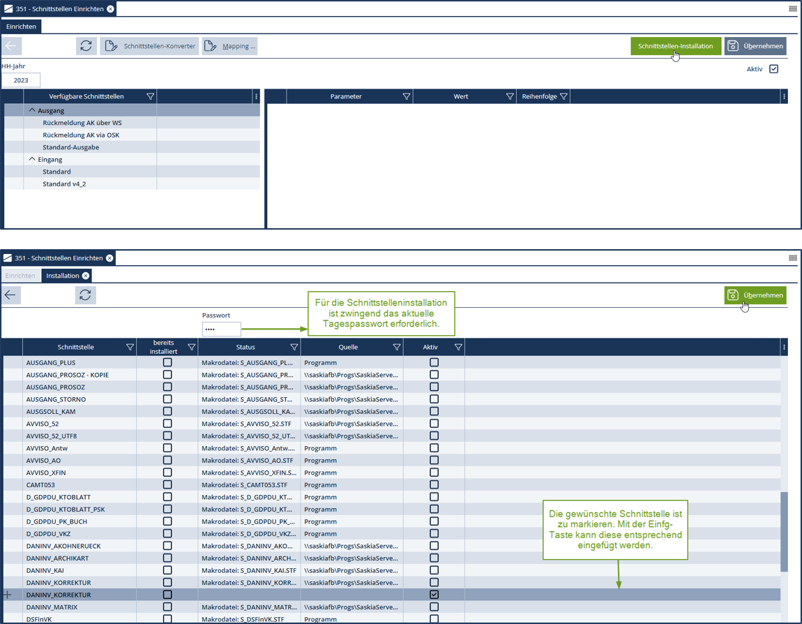 In der Übersicht werden alle Programmschnittstellen angezeigt, die mit genutzt werden können. Schon installierte Schnittstellen werden mit einem Haken in der Spalte "bereits installiert" angezeigt. Für die Neuinstallation ist das SASKIA-Tagespasswort einzugeben, der gewünschte Datensatz in der Tabelle zu markieren und die Einfg-Taste zu betätigen. In der neu angelegten Zeile besteht in der Spalte "Schnittstelle" die Möglichkeit den Vorschlagswert durch einen geänderten Namen zu ersetzen. Danach wird die Installation mit dem Button "Übernehmen" abgeschlossen.