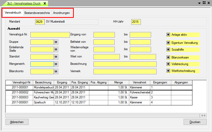 Mit dieser Funktion besteht die Möglichkeit, optional die angelegten Verwahrgüter über die Registerkarte „Bestandsverzeichnis“ insgesamt oder über das Register „Verwahrbuch“ einzelne, ausgewählte Verwahrgüter auszugeben. Über die Registerkarte „Anordnungen“ kann außerdem eine bestimmte Auswahl erzeugter Anordnungen für Abgangsverwahrgüter gedruckt werden. Die Druckausgabe wird über den Button „Drucken“ gestartet.