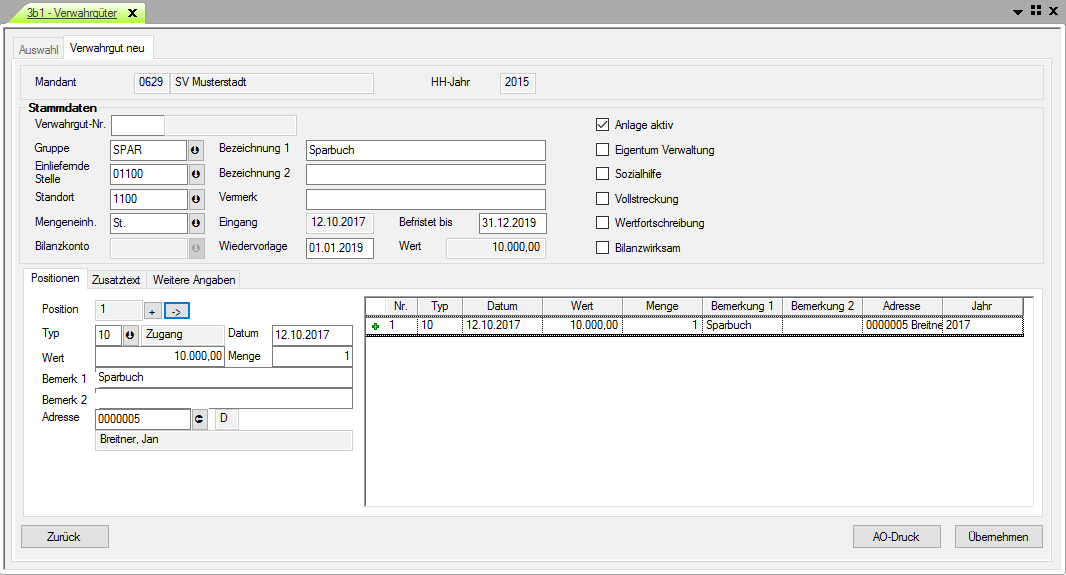 Nach der Eingabe der relevanten Verwahrgutstammdaten werden unter dem Teilregister „Positionen“ alle ergänzenden Eingaben erfasst und durch Klick auf den Button „ - “ in die Übersichtstabelle eingefügt. Mit einem Klick auf den Button „ + “ können weitere Positionen zu diesem Verwahrgut analog angelegt werden. Unter den Teilregistern „Zusatztext“ und „Weitere Eingaben“ besteht die Möglichkeit, ergänzende Informationen zum Verwahrgut zu hinterlegen. Abschließend wird die Anlage durch die Betätigung des Buttons „Übernehmen“ gespeichert und in die Verwahrgutverwaltung übertragen.