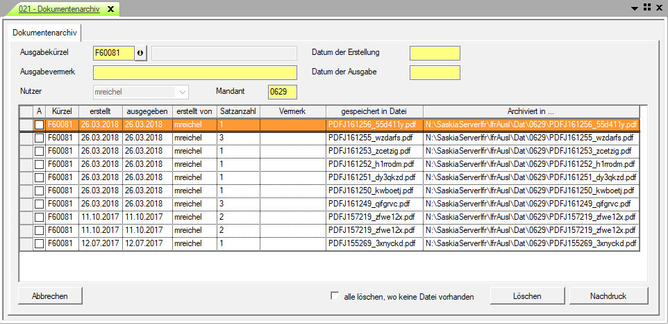 Nach Auswahl des betreffenden Ausgabekürzels und ggf. weiterer Selektierung in den Feldern "Ausgabevermerk" oder "Datum ..." werden nach der Aktualisierung der Ansicht mit der F5-Taste bzw. Aktualisierungsbutton die archivierten Dokumente in der Übersicht angezeigt. Durch Einschränkungen in der Systemverwaltung ist es u. U. möglich, dass nicht alle Nutzer Zugriff auf alle erstellten Dokumente haben. Es werden dann nur die vom Nutzer selbst erstellten Dokumente angezeigt und können entsprechend nachgedruckt werden. Der Nachdruck findet nach Markierung der betreffenden Tabellenzeile über den gleichnamigen Button statt.