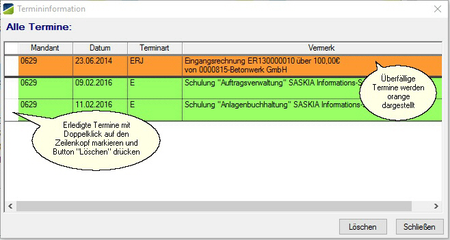 Im Dialogfenster „Termininformation“ sind alle erfassten und noch nicht gelöschten Termine der Vergangenheit bis einschließlich des aktuellen Tagesdatums aufgelistet. Bereits erledigte Termine können in dieser Ansicht durch Doppelklick auf den Zeilenkopf mit einem „ X “ markiert und durch Betätigung des Buttons „Löschen“ entfernt werden. Über den Button „Schließen“ wird die Aufgabenliste verlassen.