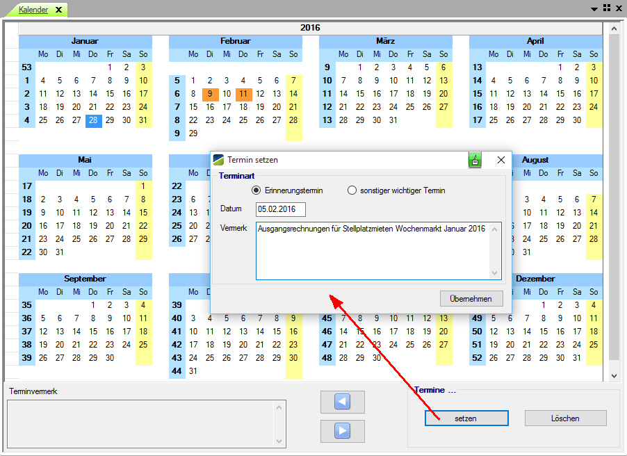 Über den Button „setzen“ können auch direkt aus der Kalenderansicht heraus neue Termine angelegt werden.