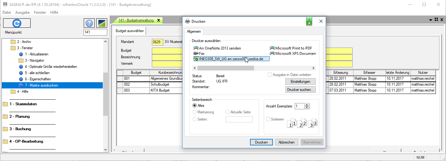 Durch die Auswahl der entsprechenden Funktion über den Schnellaufruf oder den Mausklick im Navigator öffnet sich ein Abfragefenster für die Druckausgabe. Danach ist der angeschlossenen Drucker auszuwählen und mit Betätigung des Buttons „OK“ der Druck zu starten. Es wird daraufhin das aktuell geöffnete Dialogfenster ohne die Navigatoransicht und eventuell eingeblendeter Taskleisten ausgedruckt.
