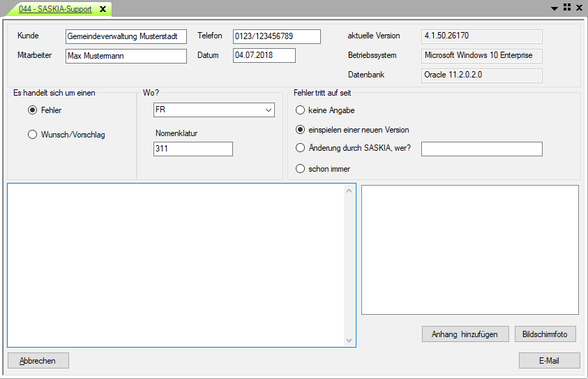 Nach dem Aufruf des Dialogfensters sind die Absenderdaten mit den Systemanmeldedaten vorbelegt und können falls erforderlich angepasst werden. Für eine schnelle Hilfe durch die Fachberatung ist nun nach Eingabe des Programmteiles im Feld "Wo ?" und der Pfadangabe des Navigators unter "Nomenklatur" eine Beschreibung des Programmverhaltens bzw. des Fehlers notwendig. Zusätzlich ist es möglich, über den Button "Bildschirmfoto" eine Ansicht der letzten geöffneten Programmmaske an die Meldung anzuhängen. Mit Betätigung des Buttons "E-Mail" wird die Support-Meldung direkt an die SASKIA-Fachberatung übermittelt.