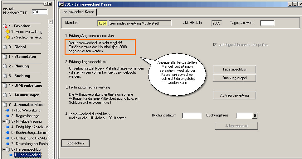 Gegebenenfalls bei der Prüfung festgestellte unvollständig bearbeitete Punkte werden konkret benannt und sind erst im Programm zu bereinigen bevor ein erneuter Versuch des Jahreswechsels gestartet wird.