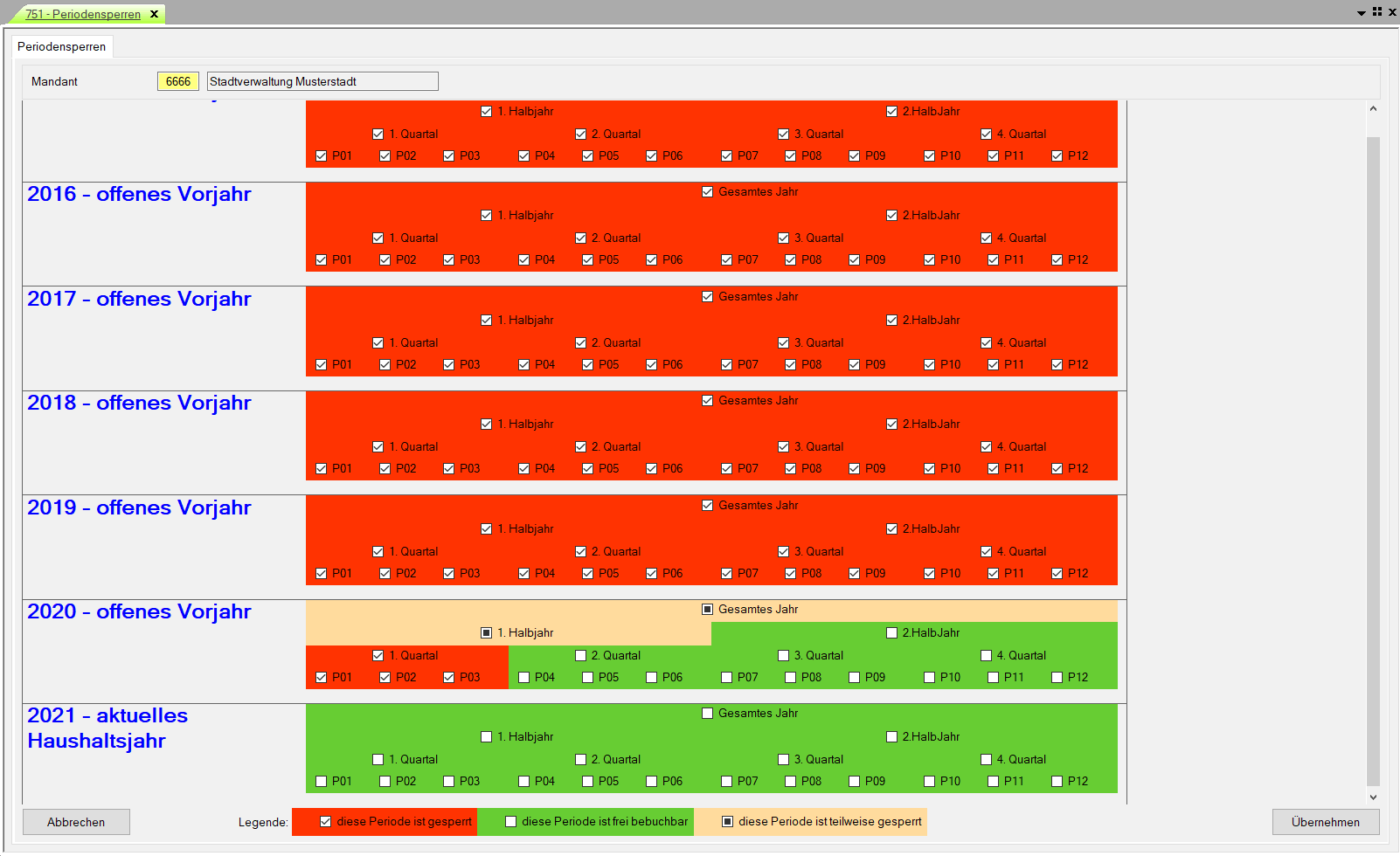 Beim Öffnen des Menüpunktes wird zunächst die Übersicht aller noch offenen Jahre bzw. Perioden angezeigt. Durch einfachen Klick in das jeweilige Feld werden die entsprechenden Bereiche gesperrt und durch unterschiedliche Farbgebung lt. Legende dargestellt.