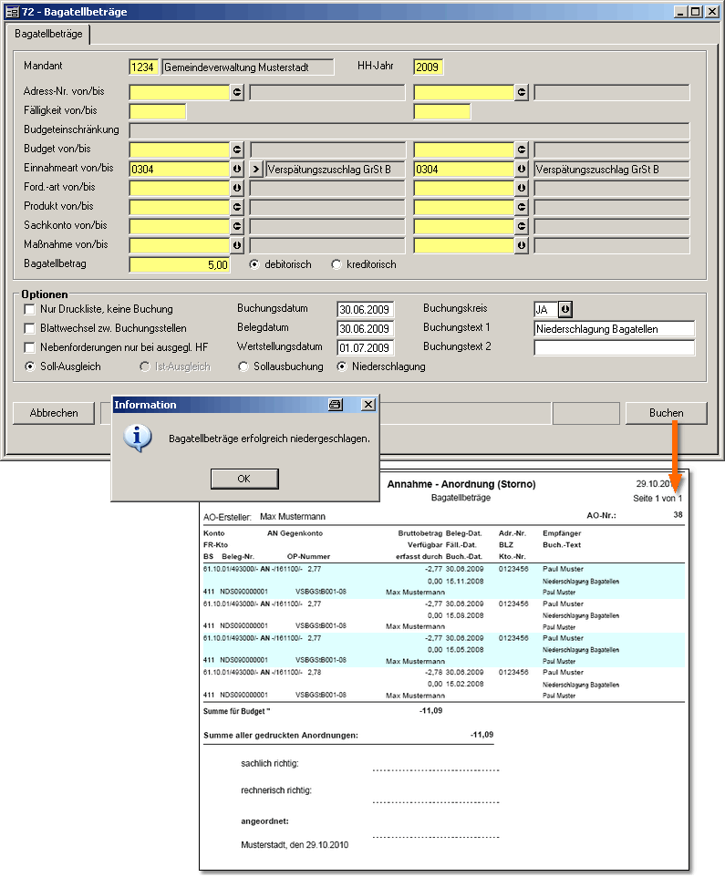| Sollausbuchung | Für die ermittelten Bagatellbeträge werden über den Button „Buchen“ einzelne Storno-Anordnungen erstellt. Diese Anordnungen sind in der Anordnungsverwaltung zu bestätigen und im Buchungsstapel freizugeben.Die offenen Posten werden storniert und werden nicht mehr im Programm angezeigt. |