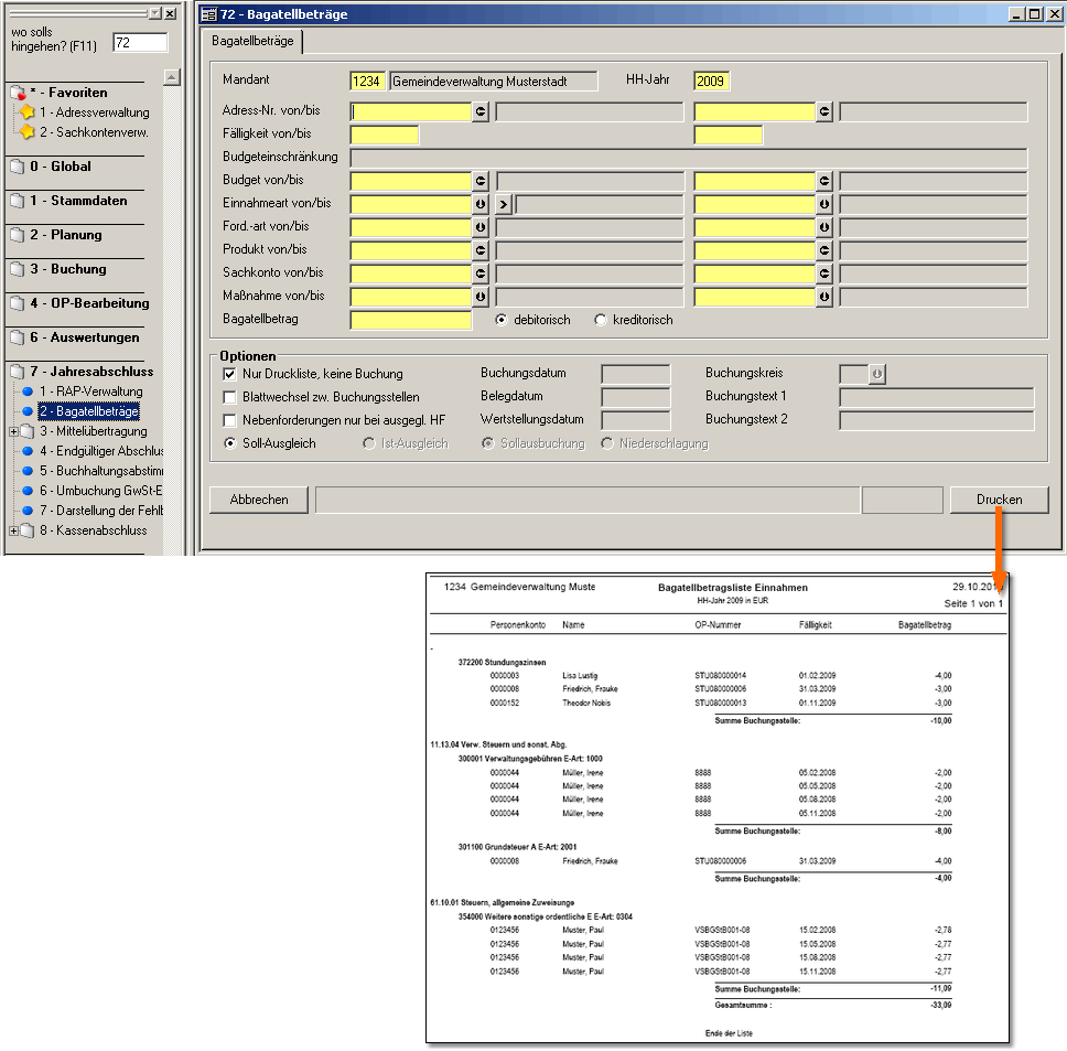 Mit aktiver Option wird die Liste der Bagatellbeträge nur gedruckt è Button „Drucken“