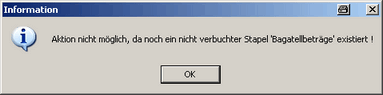 Es dürfen zum Zeitpunkt der Verbuchung einer neuen Bagatellbetragsbereinigung keine weiteren Buchungsstapel anderer Bagatellbetragsbereinigungen existieren. Anderenfalls wird nachfolgende Programminformation ausgegeben: