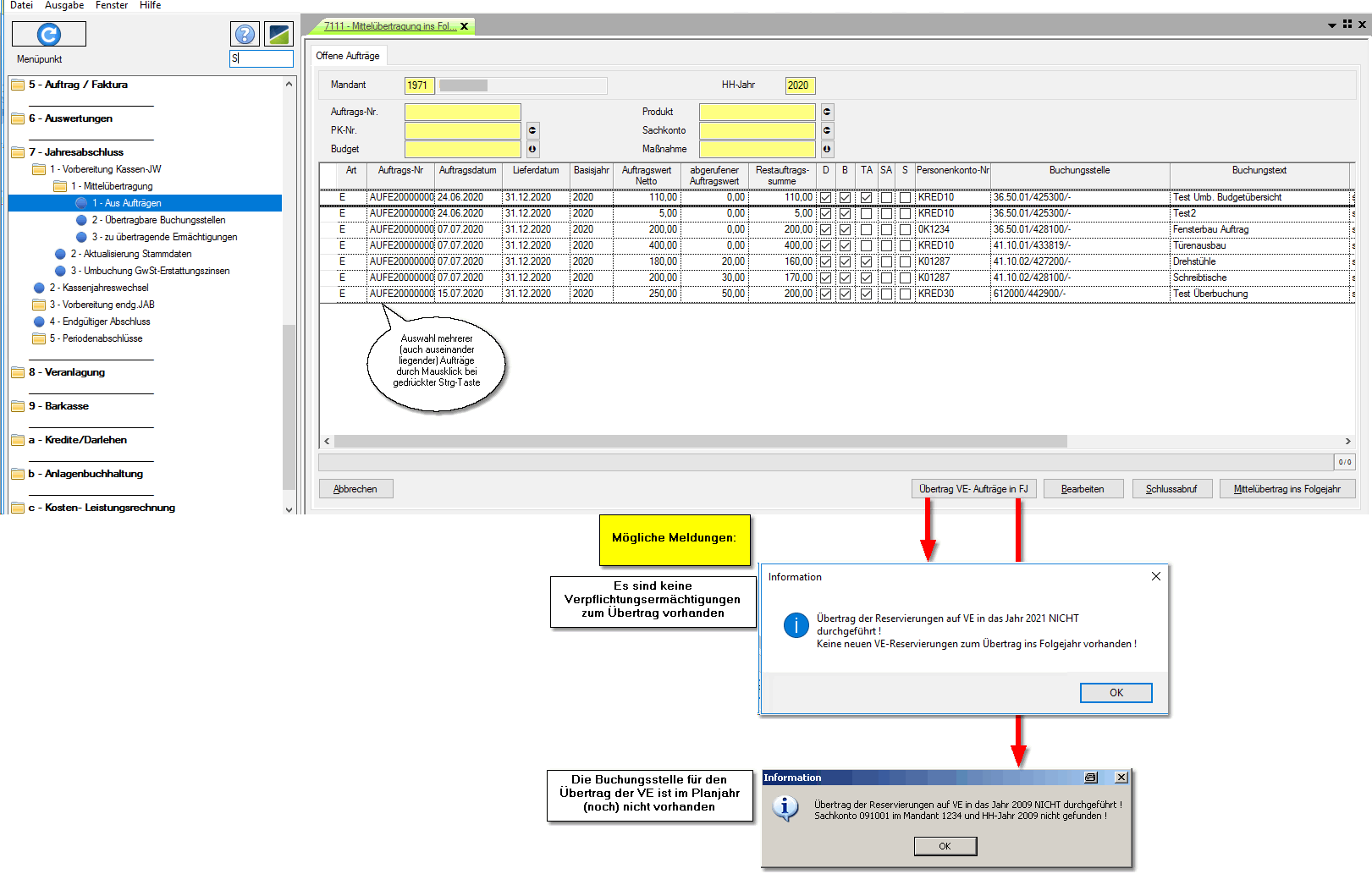 Voraussetzung für die erfolgreiche Mittelübertragung ist eine vorher durchgeführte Planableitung in das Folgejahr, damit die, in den Aufträgen verwendeten Buchungsstellen im darauf folgenden Jahr bebuchbar sind.