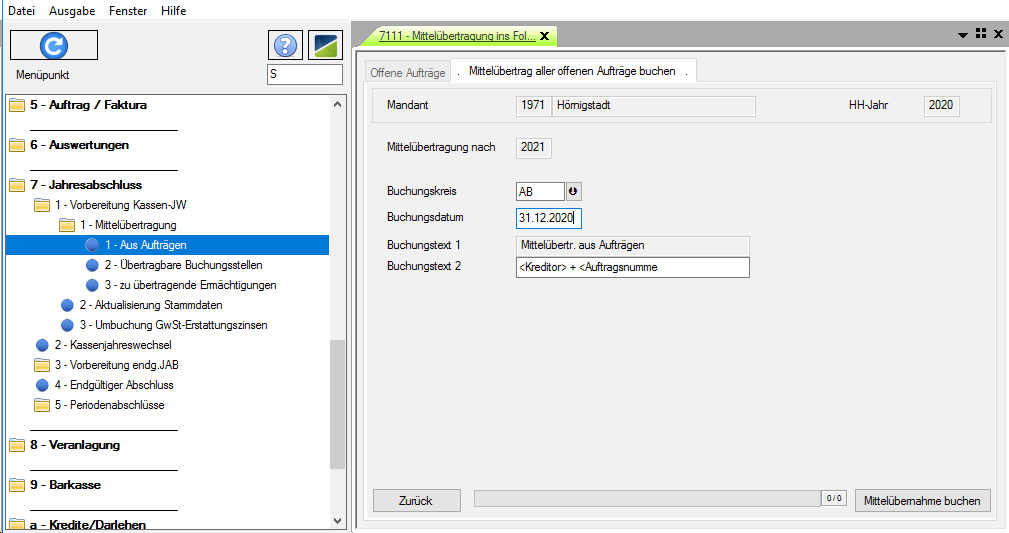 Mittelübernahme buchen Die Mittelübernahme wird gebucht, die Aufträge werden ins Folgejahr übertragen