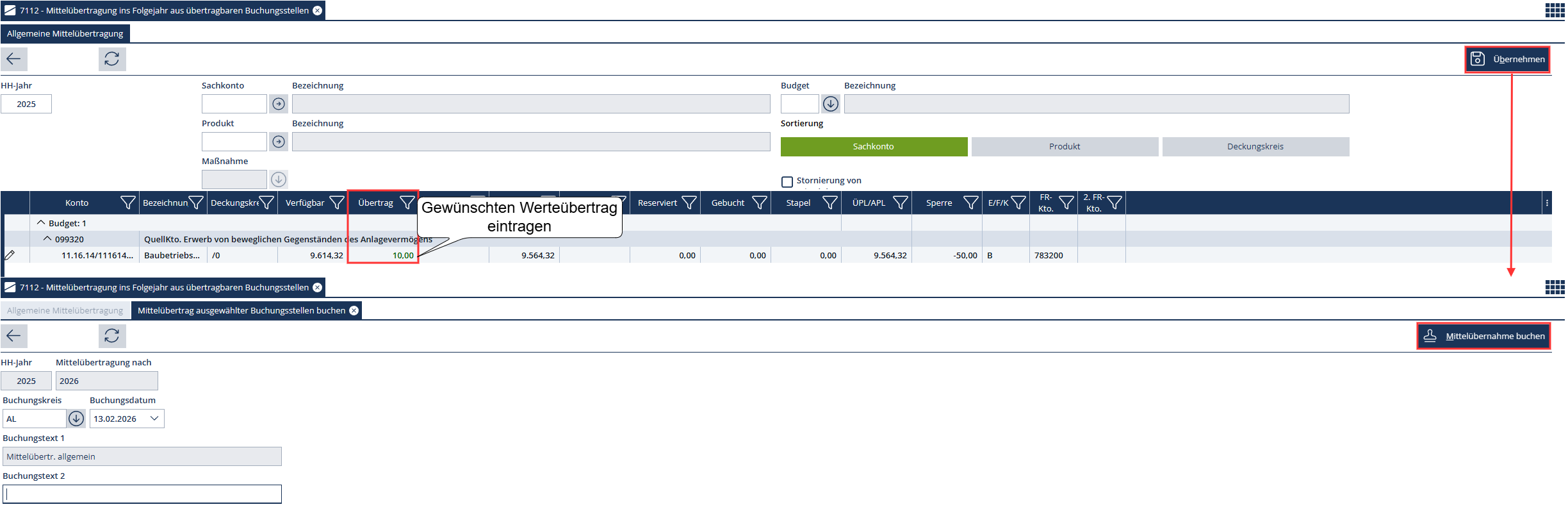 Dazu wird ein weiteres Dialogfenster geöffnet, in dem die Mittelübertragung gebucht wird.