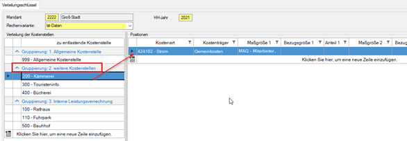 Nach Eingabe der Mandantennummer erfolgt die Auswahl des zu bearbeitenden Haushaltsjahres und der Rechenvariante. Über die getroffene Auswahl der Kostenstelle und zusätzliche Angabe in den Feldern "Kostenart" und "Kostenträger" definiert das System selbstständig in welche Gruppierung die Verteilung sortiert wird. Wird es in Gruppierung 2 - weitere Kostenstellen sortiert, ist die Reihenfolge zur Verteilung eigenständig festzulegen.