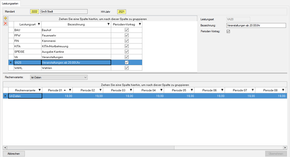 In diesem Menü erfolgt die Anlage und Bearbeitung von Leistungsarten. Das Modul ‚k – Kostenrechnung/Controlling‘ wird sichtbar, wenn sowohl die Lizenz der Istkostenrechnung und das entsprechende Menürecht vorhanden sind.