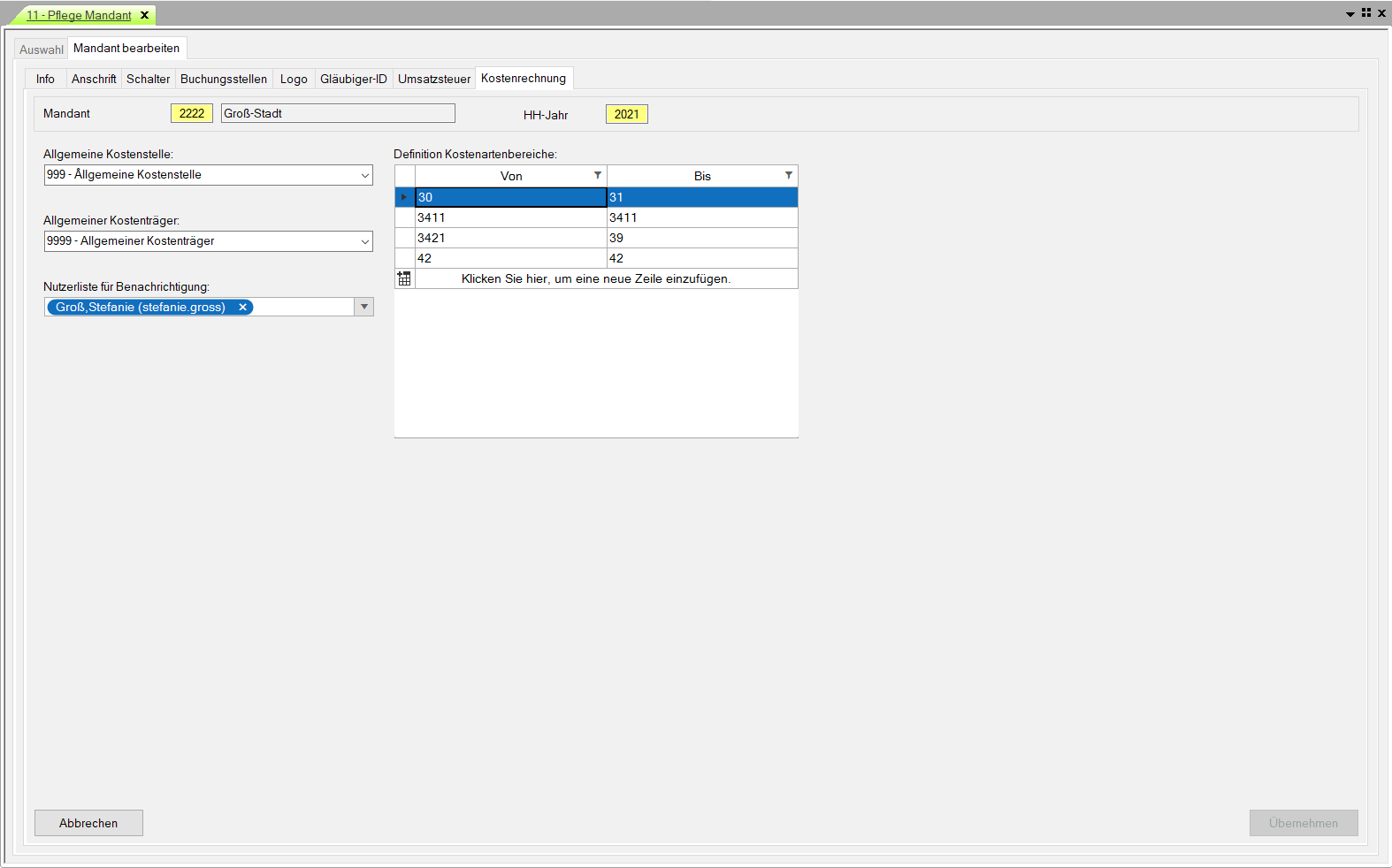 Hinterlegung von Nutzern aus dem Bereich Controlling, die eine automatische Information erhalten, wenn neue Kostenarten angelegt wurden