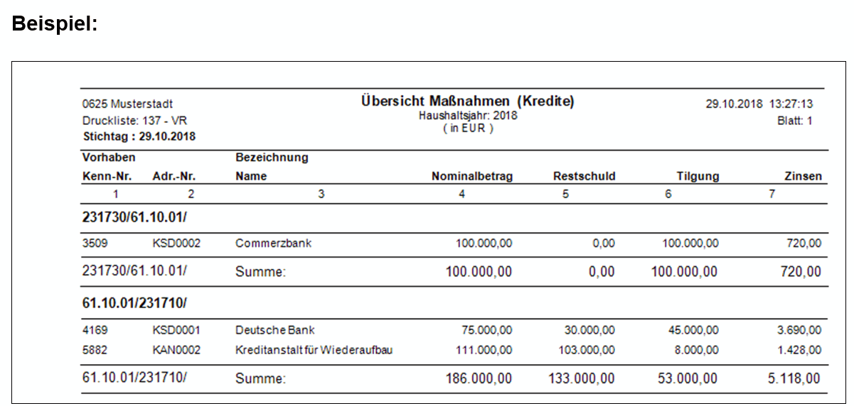 Die Liste beinhaltet den Vorhabensschlüssel bestehend aus Sachbuchteil, Gliederung und Vorhabensteil der Haushaltsstelle sowie den dazugehörenden Vorhabenstext. Zum Kredit / Darlehen werden der Kreditgeber oder der Darlehensnehmer, der Nominalbetrag, die Restschuld, die kumulierte Tilgung und der kumulierte Zinsbetrag ausgedruckt. Die Daten werden zum Vorhaben gruppiert ausgegeben, es entstehen jeweils Zwischensummen.