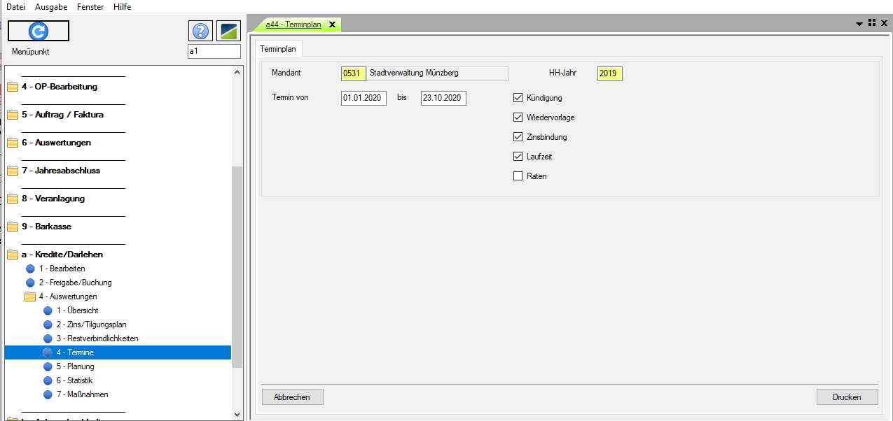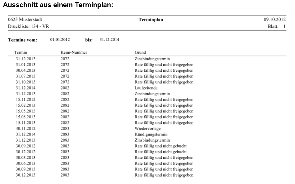 Innerhalb von diesem Menüpunkt können für einen gewünschten Zeitraum alle mit Krediten und Darlehen zusammenhängenden Termine aufgelistet werden, z.B. Kündigungstermine, Zinsbindungstermine, eingetragenen Wiedervorlagetermine, fällige Raten, die noch nicht gebucht sind usw. Nach Auswahl des Mandanten und des Haushaltsjahres muss der gewünschte Terminbereich (Termin von / bis) eingegeben werden. Die Anzeige kann über die Auswahloptionen gefiltert werden. Wurde kein Termin gefunden, erfolgt eine Information.
