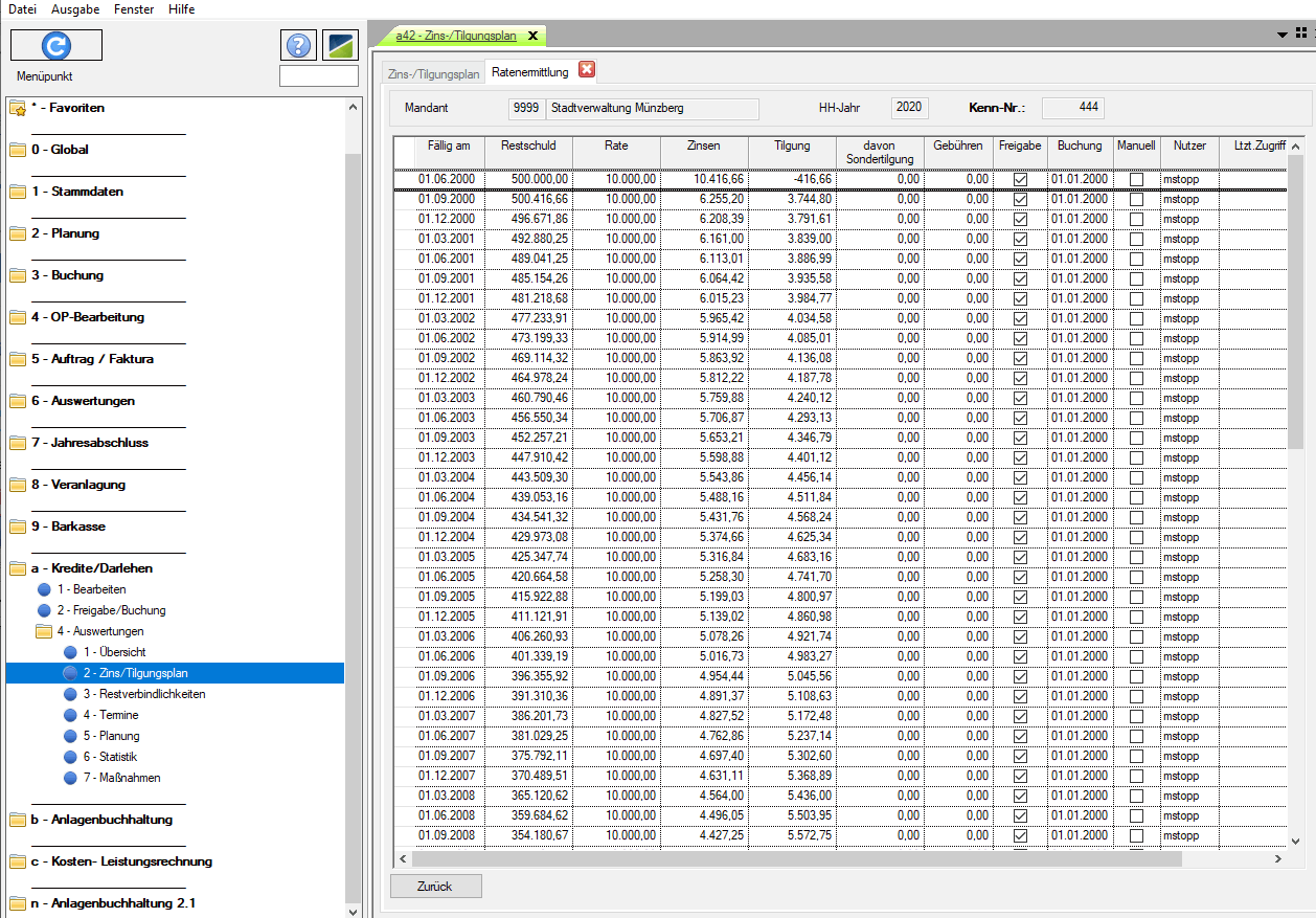 | Navigator | Schulden/Darlehen - Drucklisten - Zins/Tilgungsplan | |