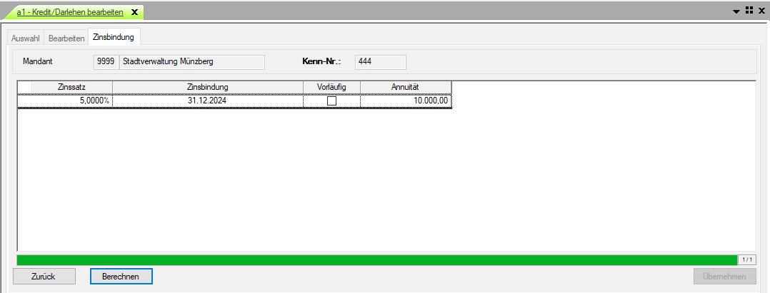 Berechnen Dieser Button wird nur bei einem Annuitätskredit sichtbar. Beim Vorliegen einer Zinsstaffel können hiermit die sich den Zinsen anpassenden Annuitäten errechnet werden. Übernehmen