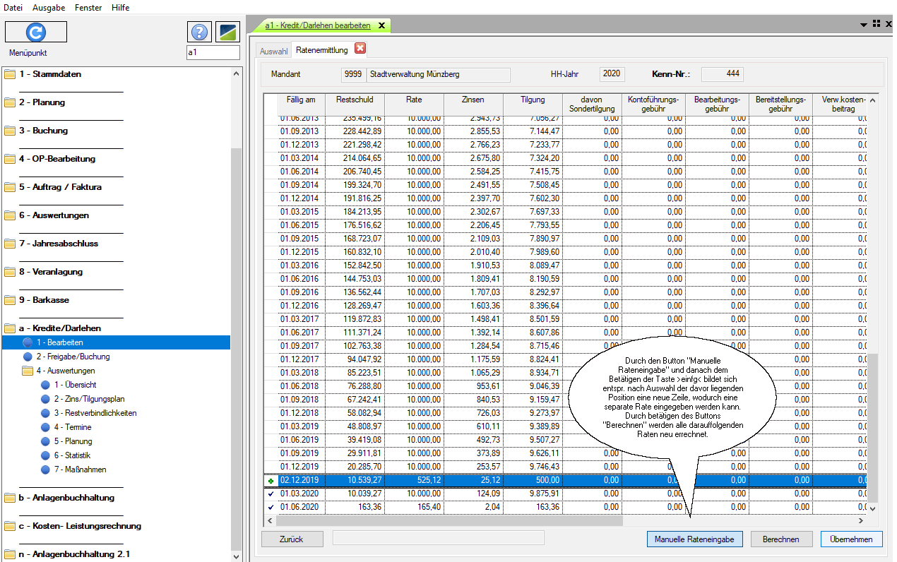 Hier sollte nur für bereits manuell gebuchte Raten ein Datum eingetragen werden, z.B. bei Nacherfassungen von Krediten, die in einem zurückliegenden Jahr aufgenommen wurden.