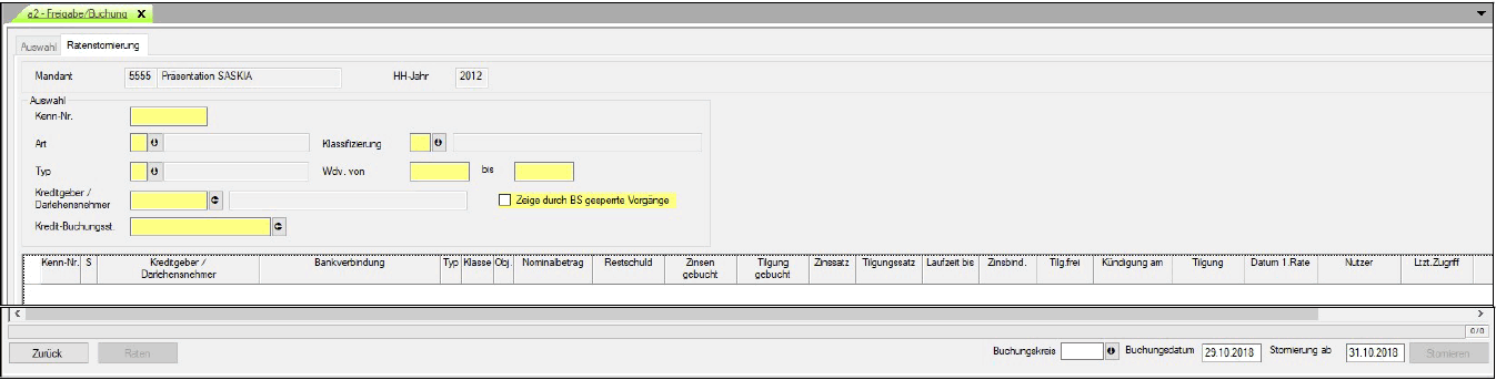 Mit dieser Funktionalität können verbuchte Raten (unabhängig davon, ob diese noch im Buchungsstapel stehen oder nicht) storniert werden.