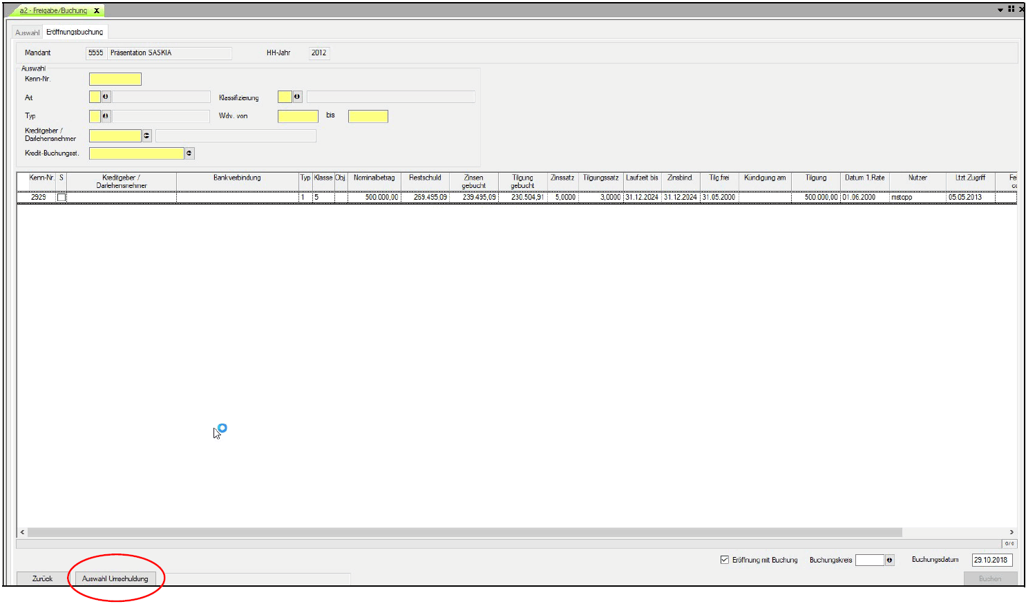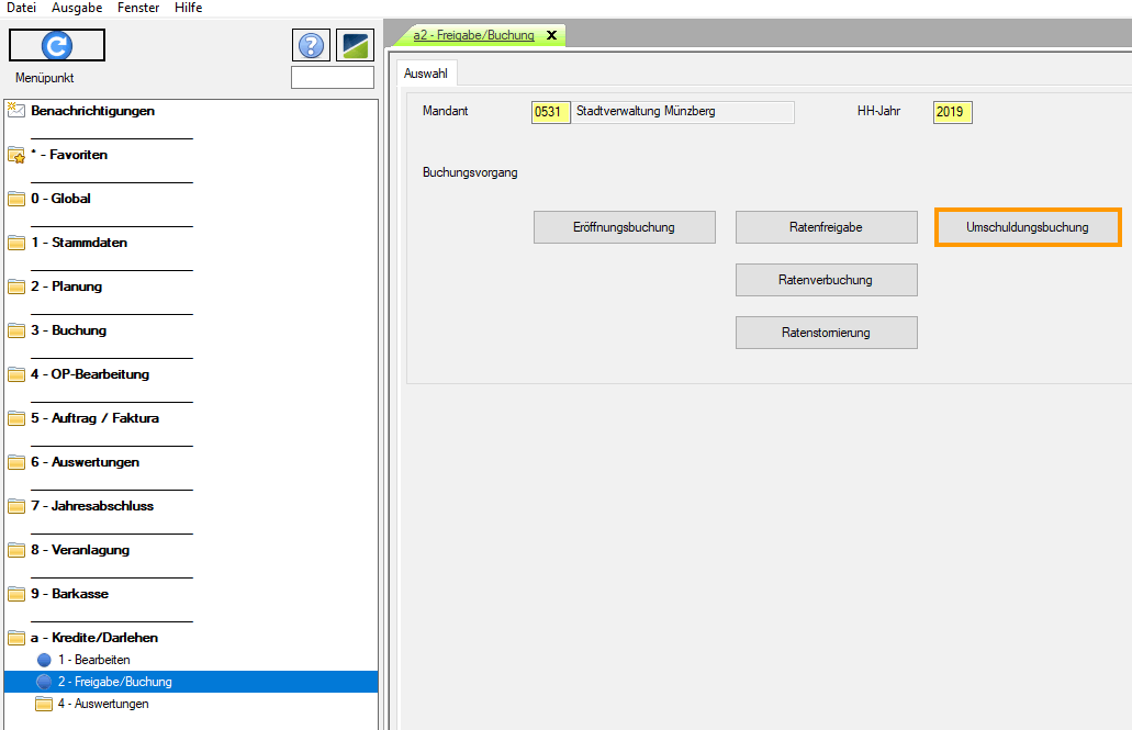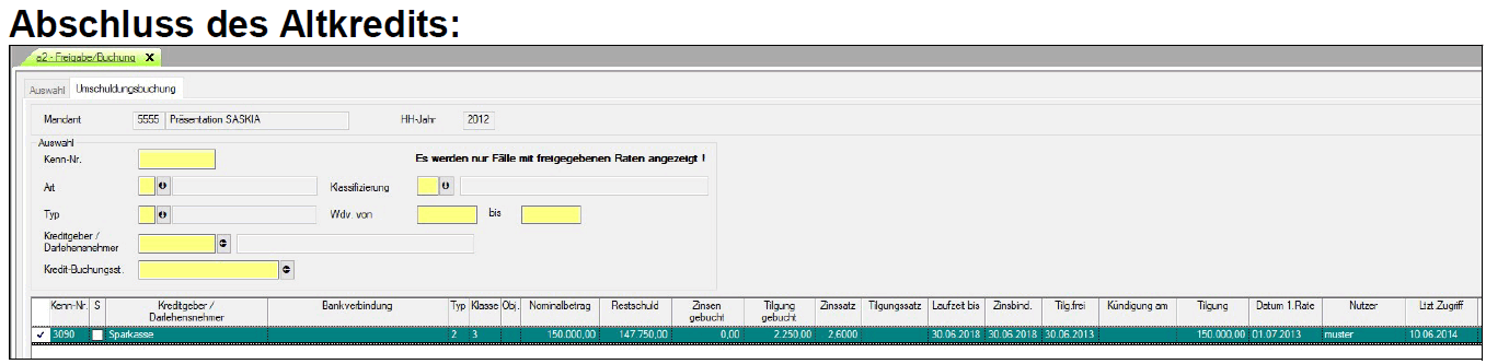 Abschluss des umgeschuldeten Kredites im Menü a2: Buchungsvorgang - Umschuldung