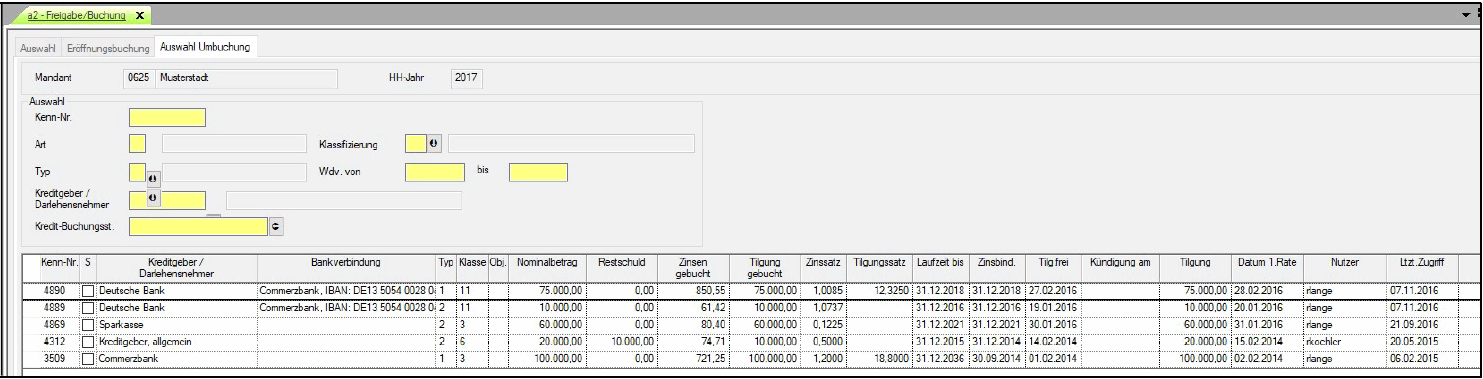 Die gewählten Altkredite sind danach in der Maske der Eröffnungsbuchung ersichtlich.