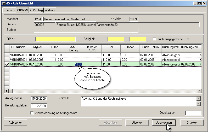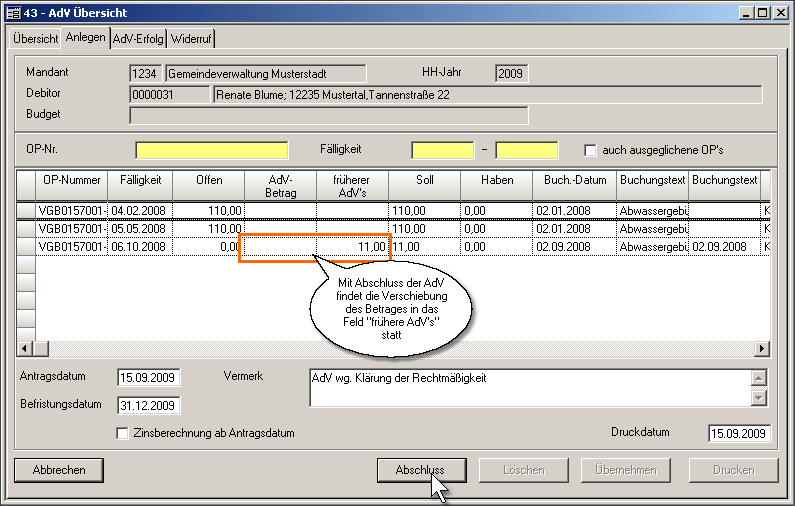 Die Erstellung einer neuen AdV erfolgt über das Register „Anlegen“ für das gewählte Personenkonto und die gegebenenfalls über die Selektionsfelder „OP-Nr.“ und „Fälligkeit“ gefilterten Offenen Posten. Durch Doppelklick links auf den Zeilenkopf des entsprechenden offenen Postens wird für diesen in das Tabellenfeld „AdV-Betrag“ der OP-Betrag übernommen und kann dort anschließend gegebenenfalls abgeändert werden. Die Fehlauswahl einzelner Positionen kann durch erneuten Doppelklick auf den Zeilenkopf wieder rückgängig gemacht werden. Nach der Vervollständigung der Eingaben des Dialogfensters wird mit dem Button „Übernehmen“ die AdV erstellt, danach durch Betätigung des Buttons „Drucken“ der AdV-Bescheid ausgegeben und anschließend mit dem Button „Abschluss“ im Programm hinterlegt. Es erfolgt dabei keine Buchung auf Sachkonten, sondern es wird lediglich der ausgewählte Offene Posten mit einer Sperre versehen.