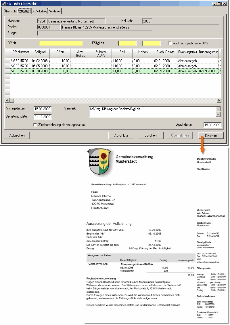 Abschluss Die Aussetzung der Vollziehung sperrt den Offenen Posten im Programm Löschen Eine übernommene AdV wird wieder zurückgesetzt und der Ursprungs-OP wiederhergestellt Übernehmen Der eingegebene Betrag der AdV wird gespeichert Drucken Es wird der AdV-Bescheid gedruckt